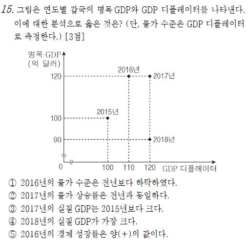 2018년의 실질 GDP가 가장 크다고 하는데, 연도별로 15년은 1, 16년은 120/110=1.09, 17년은 1, 18년은 90/120=0.75, 18년이 제일 작네요.