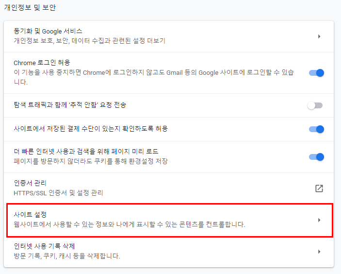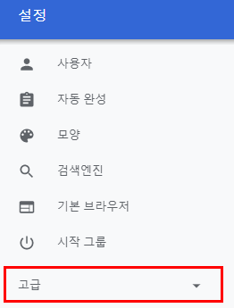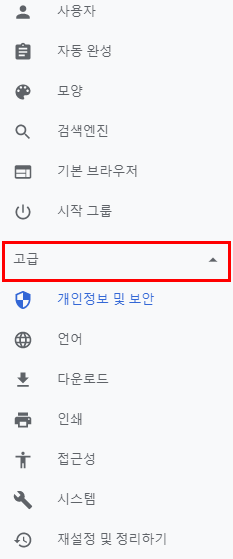 설정에서 고급을 클릭한 다음, 개인정보 및 보안을 클릭한다.
