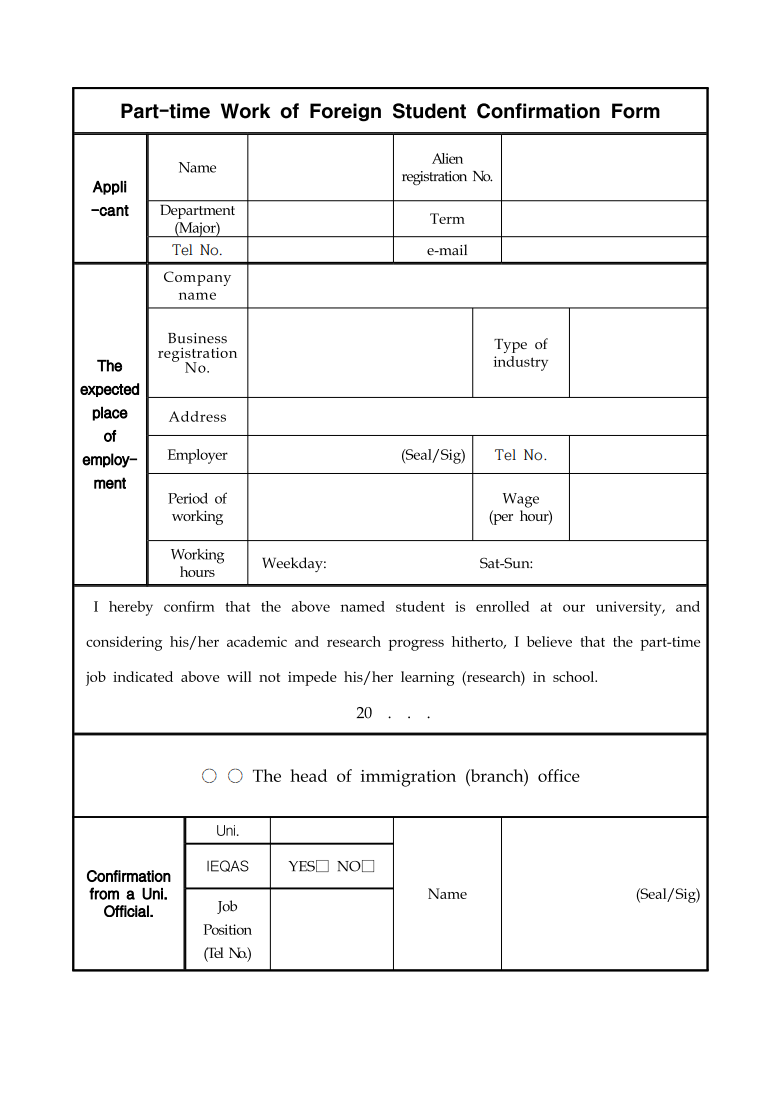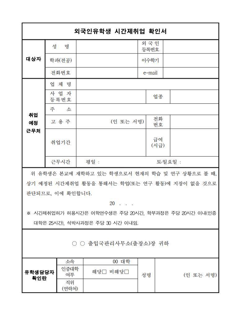 아래에 외국인유학(어학연수)생 시간제취업 확인서 양식을 올려드렸습니다. 파일은 총 3가지 버전으로, pdf파일, hwp 한글파일, 워드파일이 있습니다. 필요한 파일을 다운받으시기 바랍니다.