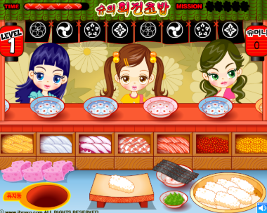 슈의 회전초밥 플래시게임은 손님들이 원하는 초밥을 빠르게 만들어주는 게임입니다.