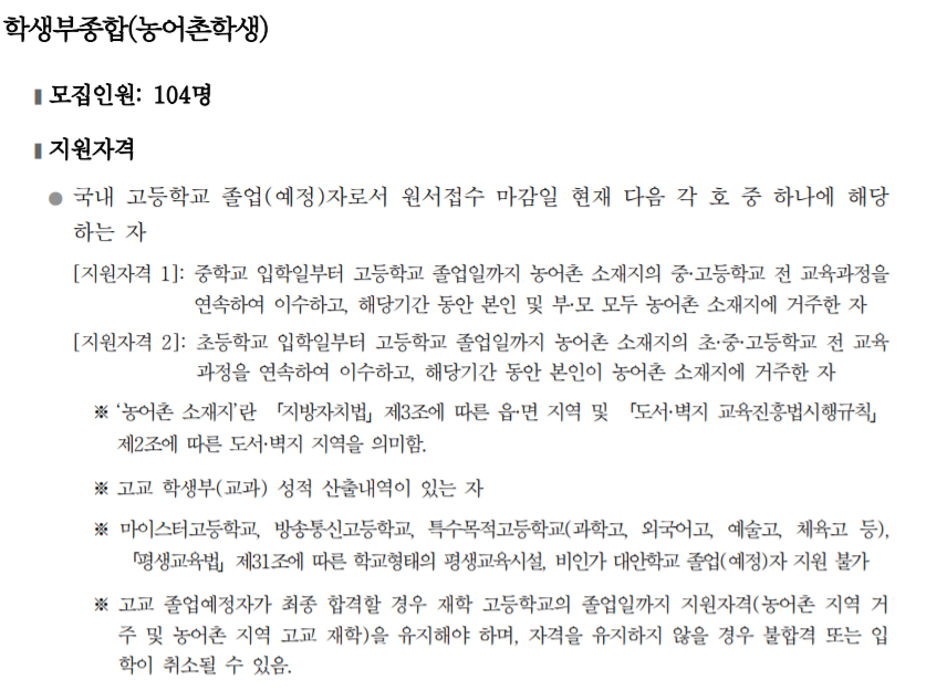 지원자격은 중학교 입학일~고등학교 졸업일까지 농어촌 소재지의 중고등학교 교육과정을 연속하여 이수하고, 해당기간동안 본인과 부모 모두 농어촌 소재지에 거주한 자거나, 초등학교 입학일부터 고등학교졸업일까지 농어촌 소재지의 초중고 모든 교육과정을 연속해서 이수하고, 해당기간동안 본인이 농어촌 소재지에 거주한 자라면 지원가능합니다.