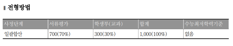 전형방법은 학생부종합 공통방법인 서류70점, 학생부(내신) 30점 합산으로 선발하게 됩니다.